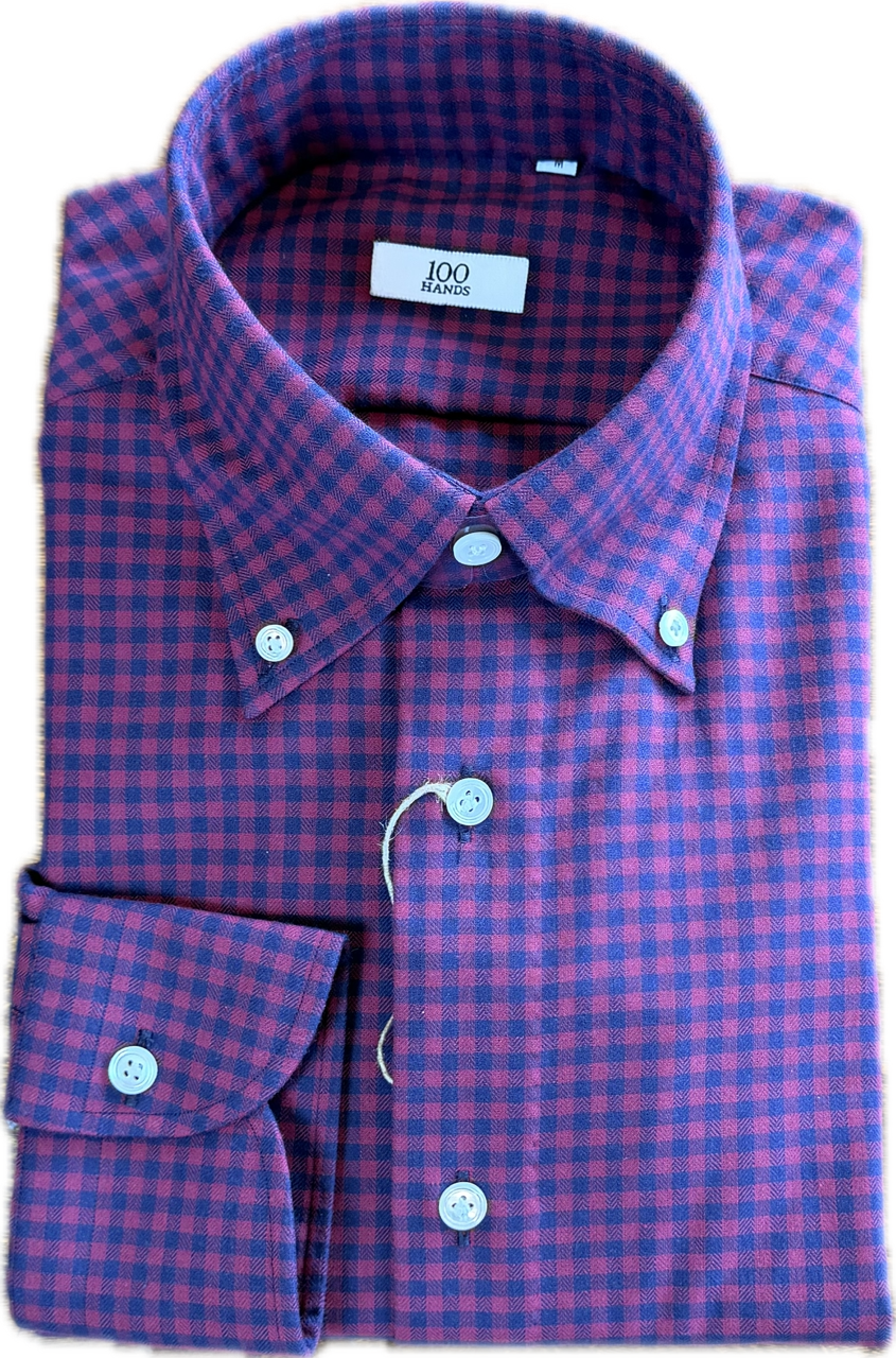 The subtle red-and-navy micro-check pattern adds depth without overwhelming, making it easy to pair with denim, cords, or under a sport coat. Finished with 100 Hands’ signature hand-stitched details throughout, including the buttonholes, placket, and collar construction, each shirt requires hours of careful work by skilled artisans.