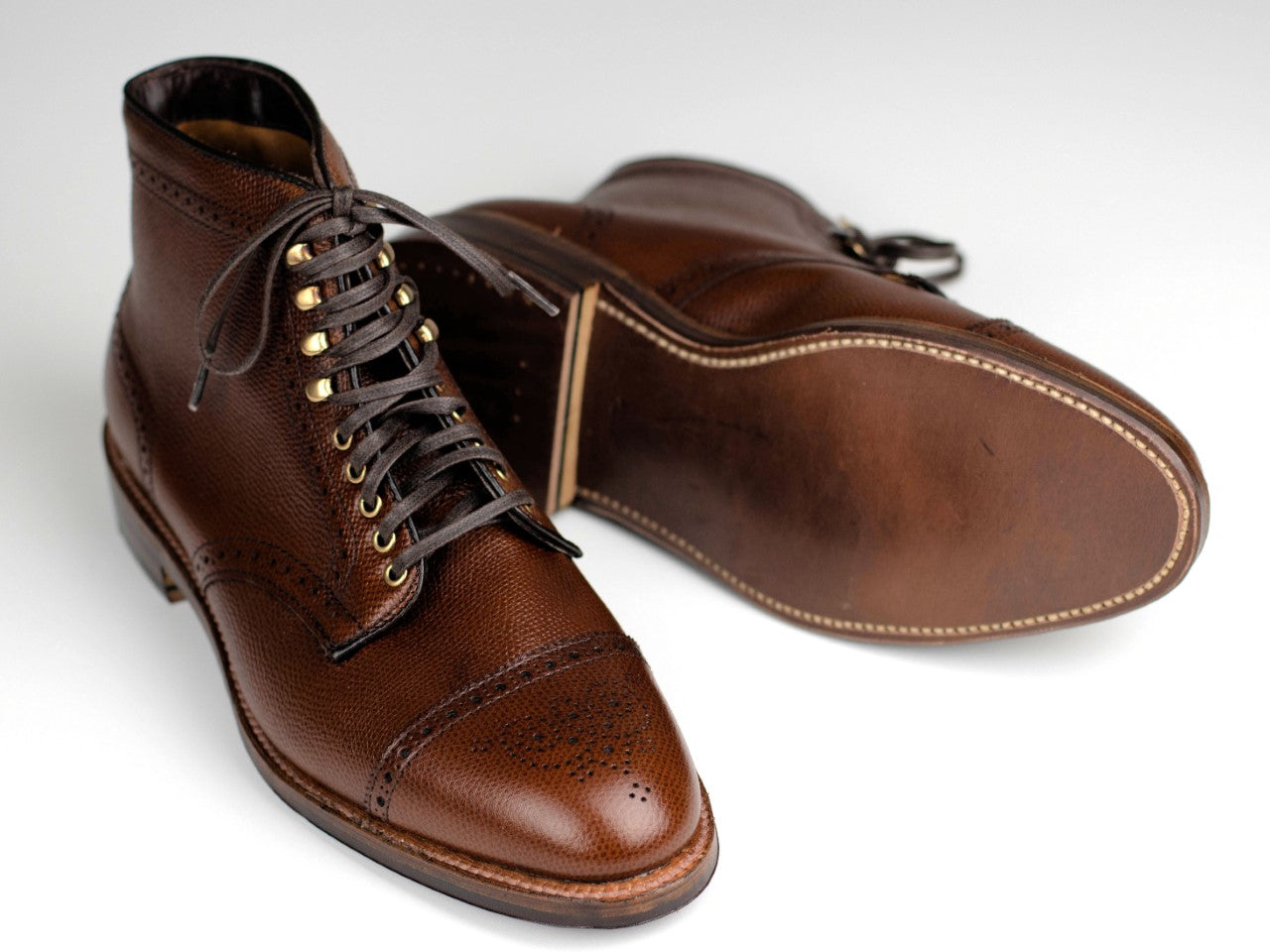 Refined and rugged! This boot that can be dressed up as easily as it can be dressed down. The broguing and alpine grain leather gives this shoe a real rustic feel, while the boot being constructed on Alden's Hampton last (typically used for oxfords) and the oiled sole polish the boot off. This is our very first special make up boot with Alden.