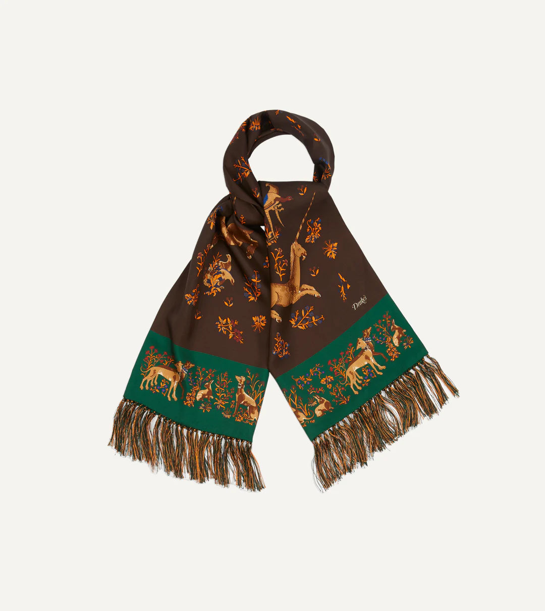 Drake's Unicorn Print Tubular Silk Tasseled Scarf - Brown