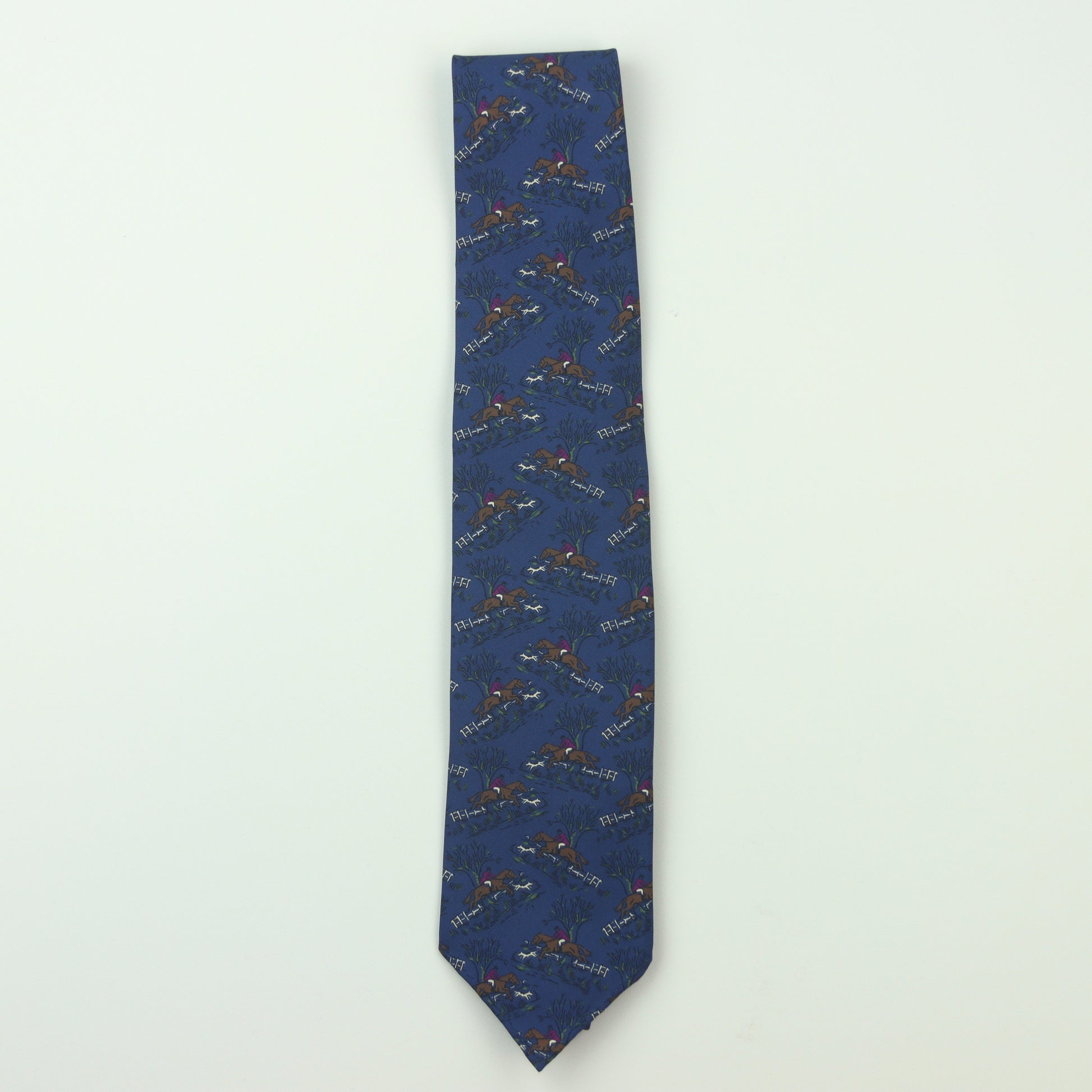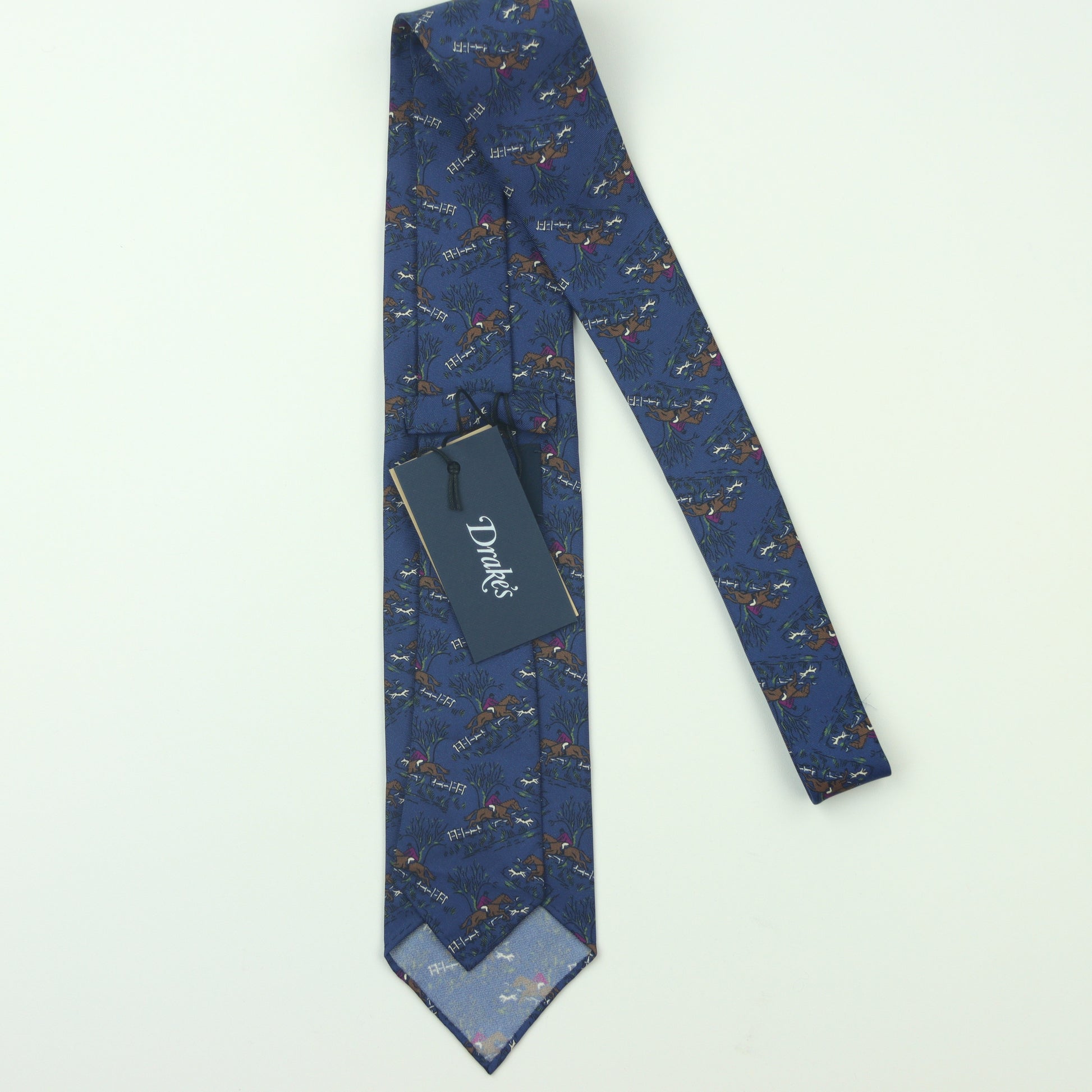Drake's Hunting Scene Silk Hand Rolled Necktie - Blue