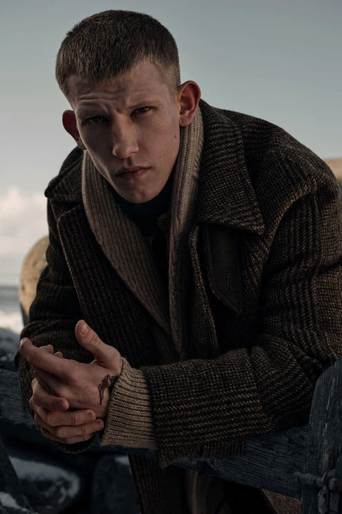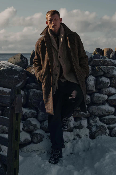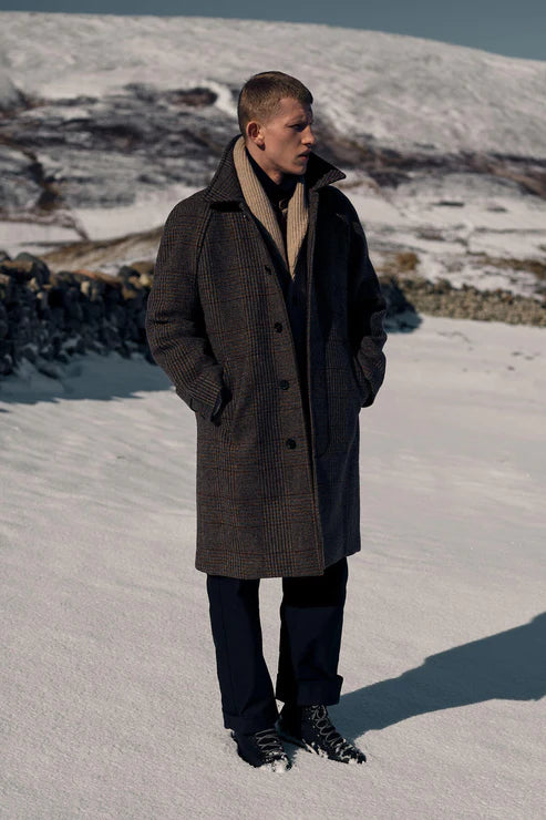This authentic Scottish, oversized wool overcoat is half-lined and has bound internal seams. The Balmacaan features double pockets with cashmere pocket bags and a removable throat guard.