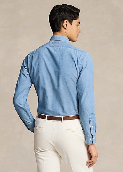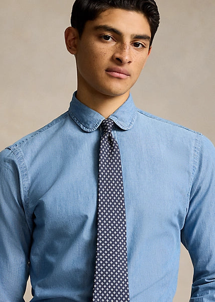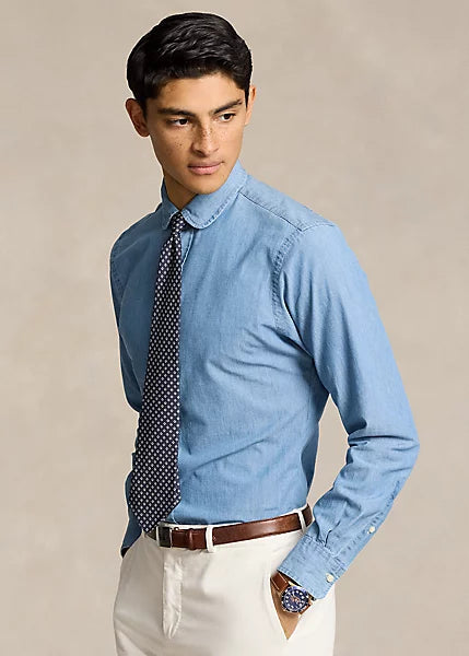 This shirt combines the workwear heritage of indigo-dyed chambray with a refined club collar for a distinctive Polo look.