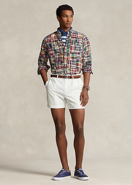 Sourced from the Indian city that invented the colorful, lightweight fabric, this shirt’s authentic cotton madras is woven into a patchwork design consisting of five different patterns.