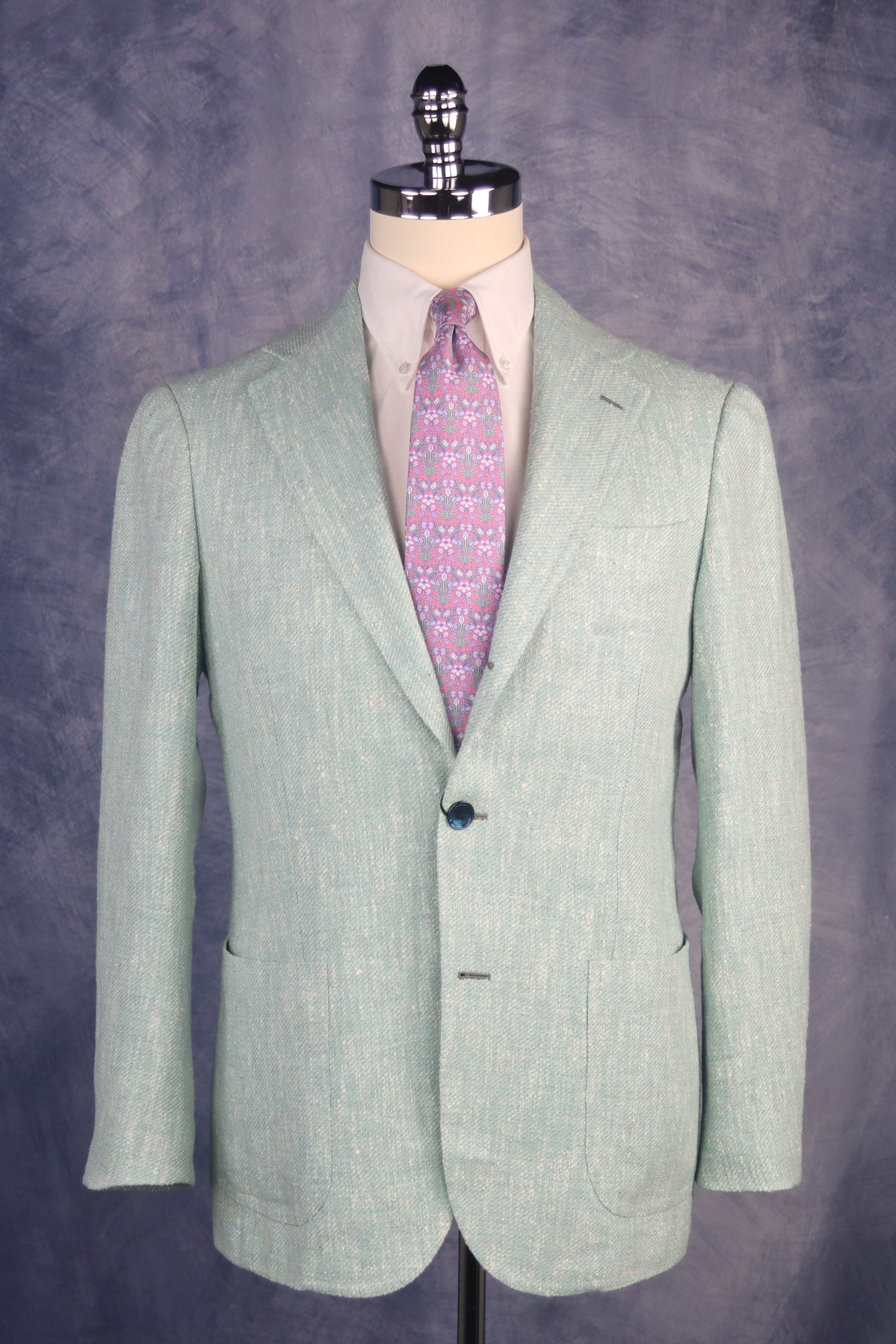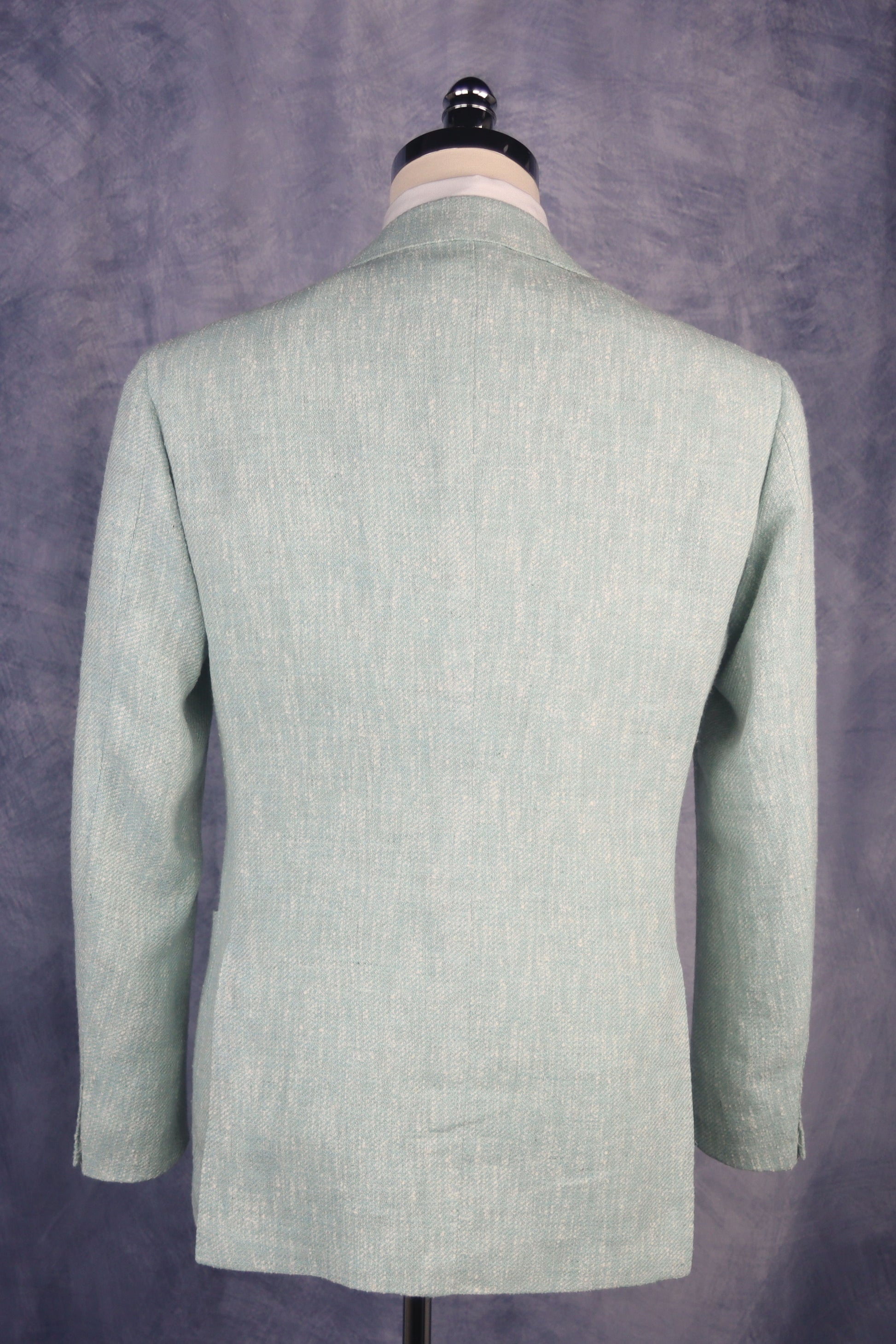 This Ring Jacket Linen, Wool, Silk and Nylon blend jacket in Mint Green is perfect for the warm summer months. The Meister model uses a high quality constructed canvas, a higher armhole and more handwork including a true bespoke tailoring level of finish. The Meister model also has Neapolitan tailoring styles including a soft full canvas construction, 3 roll 2 button stance and a wider rolling lapel.