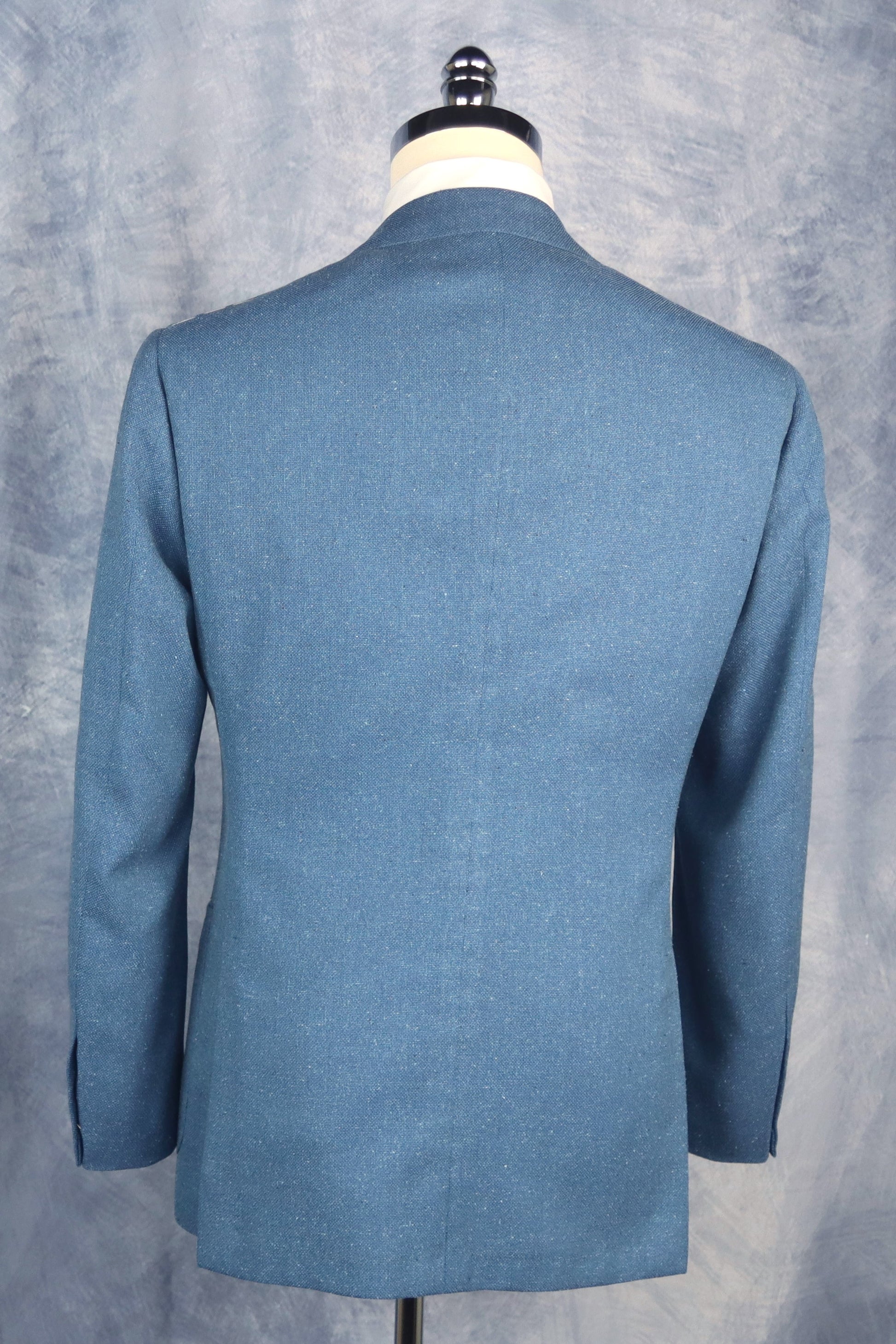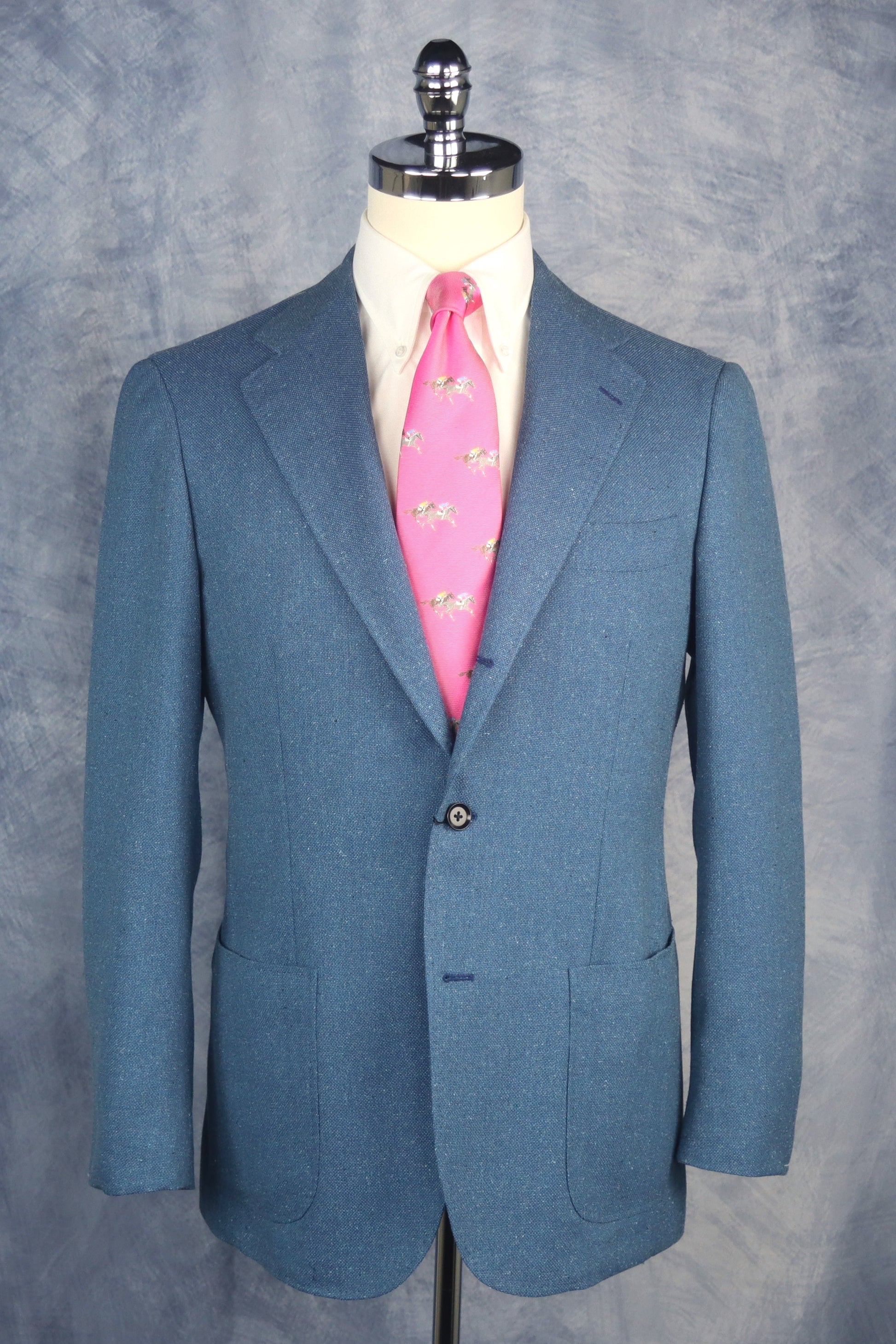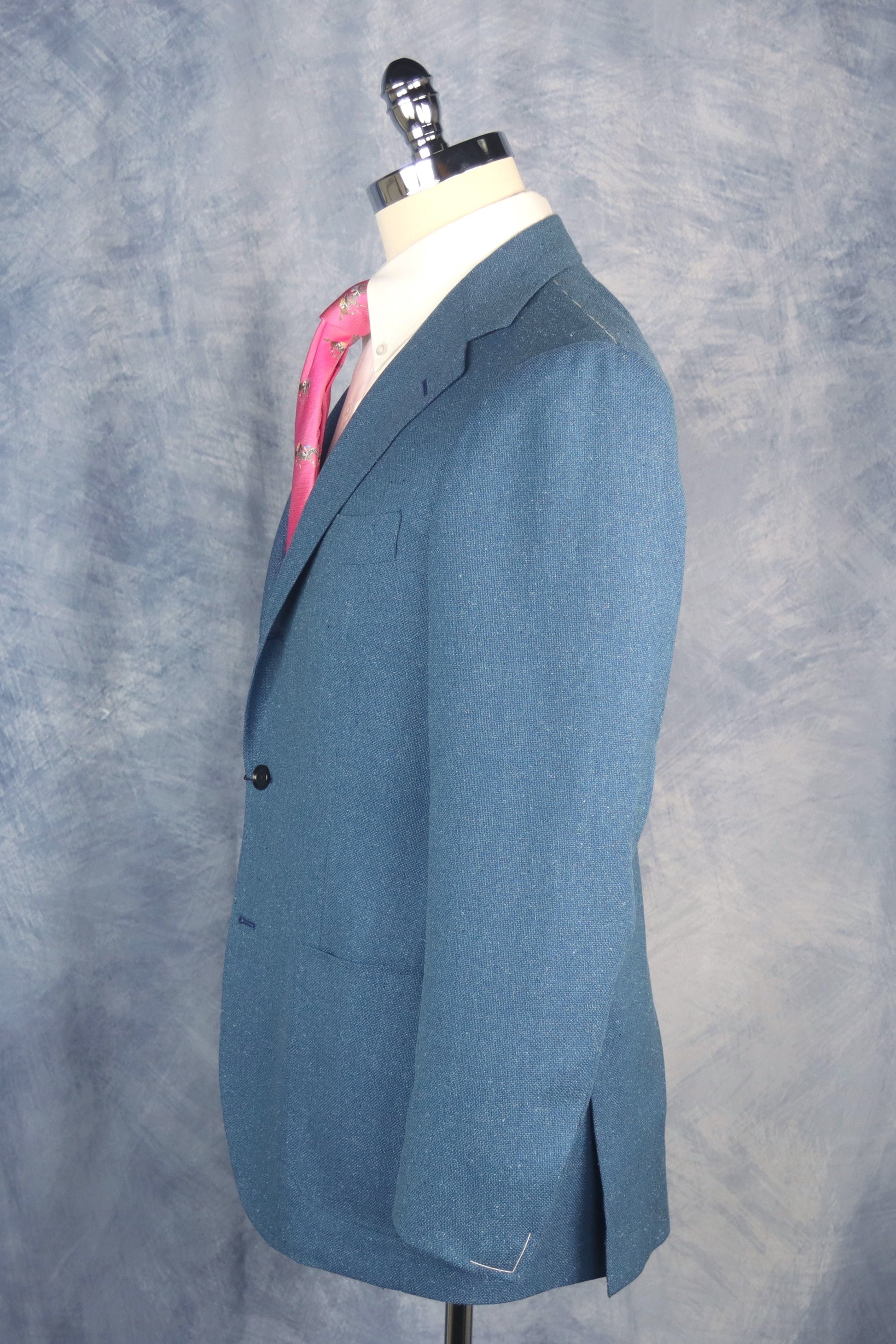 This Ring Jacket Textured Wool & Silk blend jacket in Blue is perfect for the warm summer months. It sports a soft full canvas construction, 3 roll 2 button stance and a wide rolling lapel with a high notch.