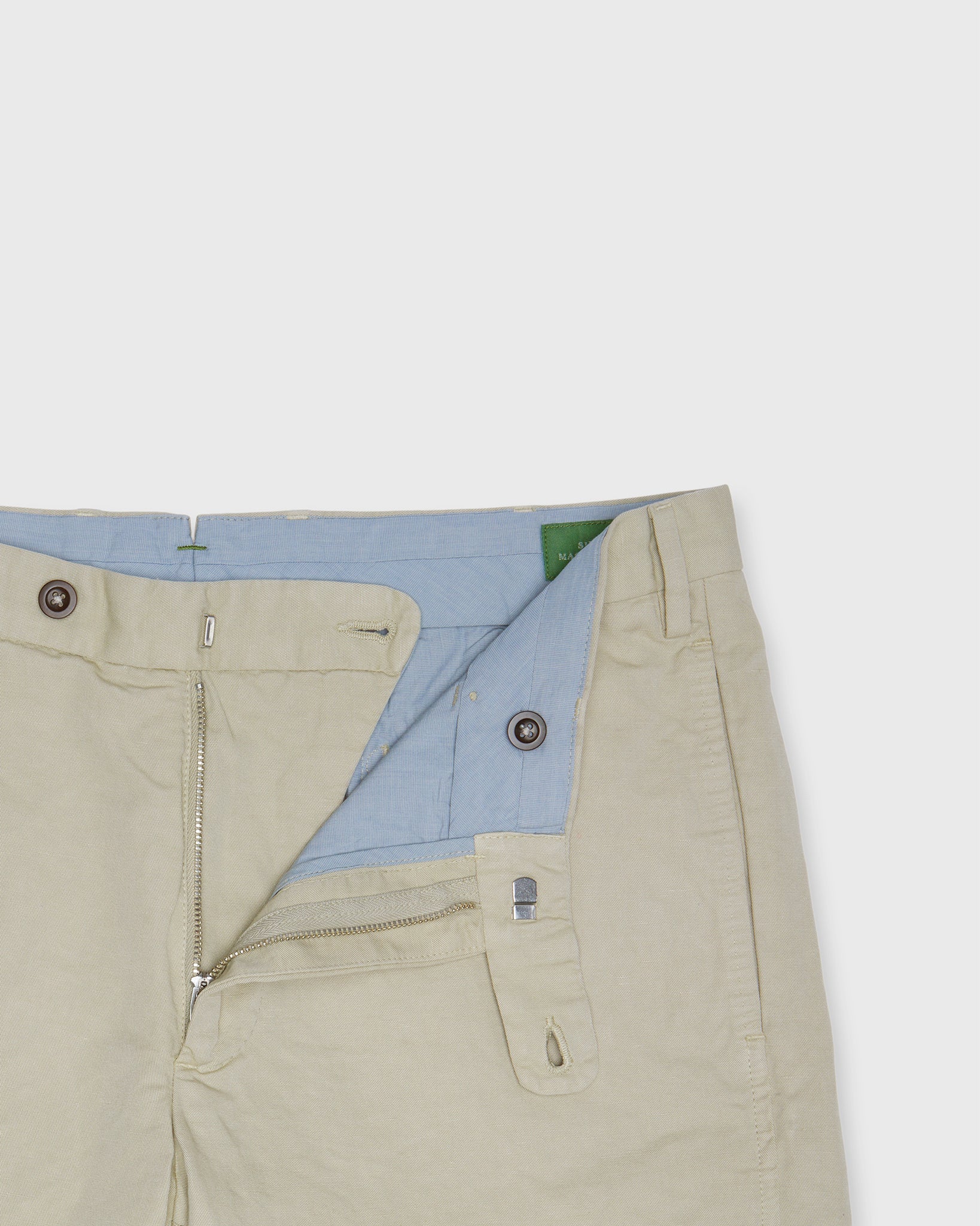 Summer-ready shorts made from Italian cotolino, a beautifully textured twill with almost equal parts cotton and linen. Each pair has been garment-dyed to a goes-with-everything shade of sand, which gives the color a slightly lived-in, variegated quality from the get-go. The shape has all the detail of our sport trouser (just a few feet shorter) with corozo buttons, on-seam pockets, end-on-end pocketing, a split-back waist with our signature green bartack, and a 7" inseam that hits above the knee.