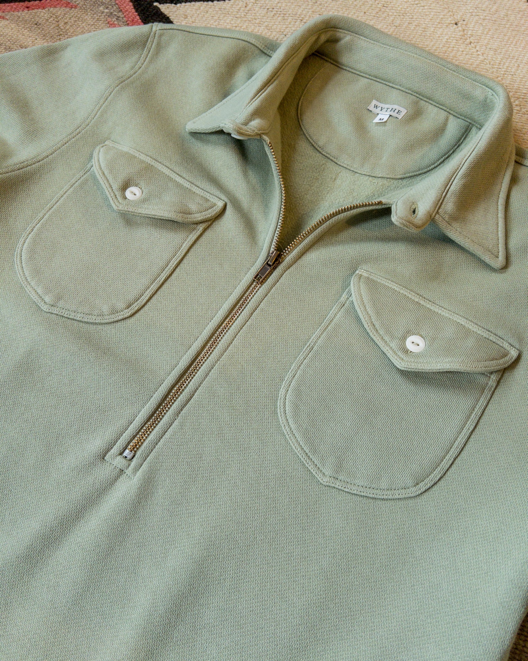 Through the countless hours Wythe has spent pouring over their archival garments and historical photographs, Wythe found themselves up to their ears in beautiful vintage half-zip workshirts. Rather than going after a 1-to-1 recreation of those beauties, Wythe decided to put a fun little spin on the half-zip shirt.