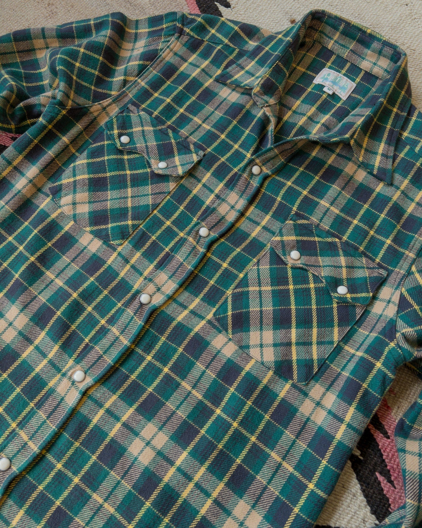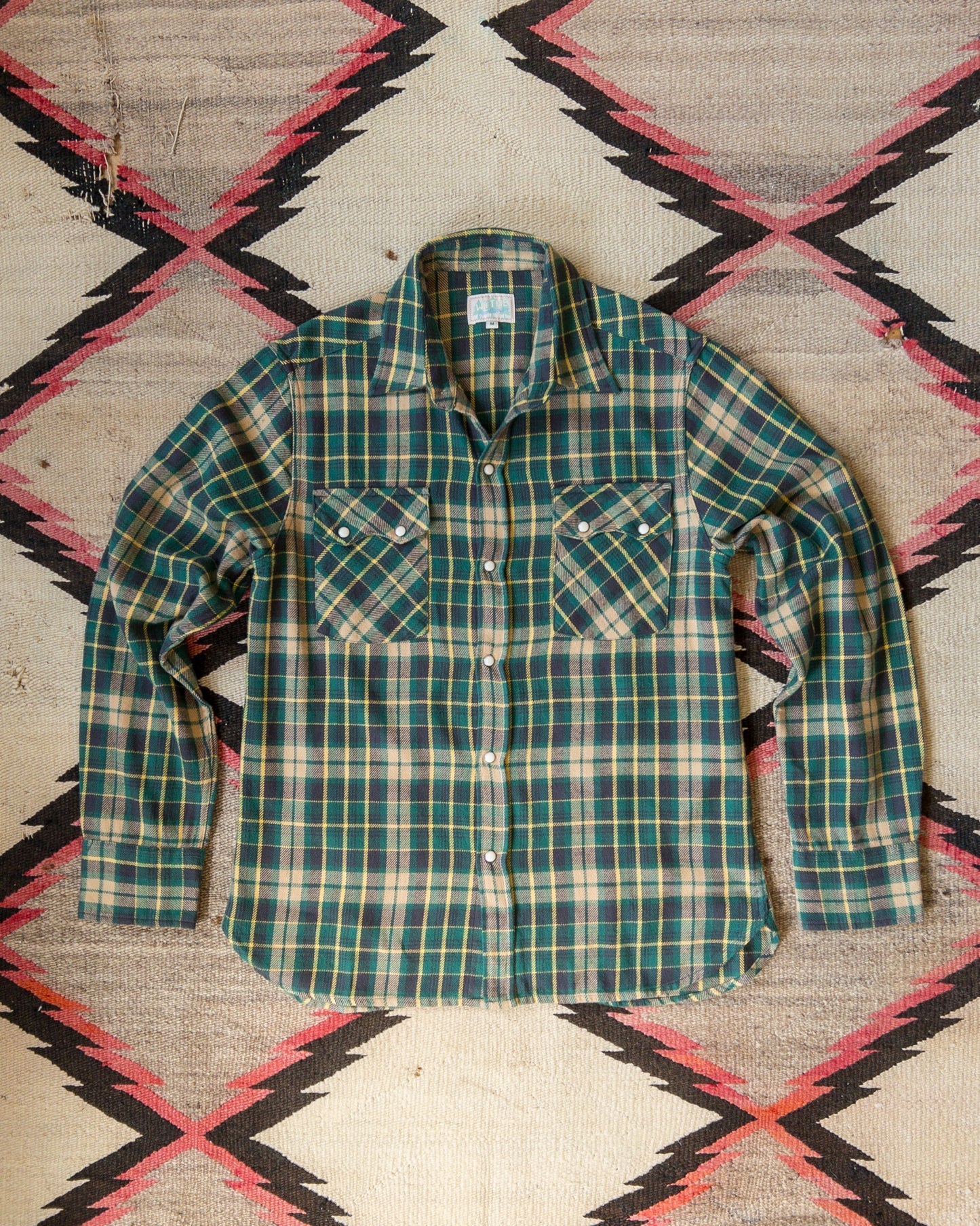 These flannel pearlsnap shirts are a real labour of love from all areas and come from hundreds of hours scouring vintage stores, private sellers, and pouring over hundreds of historical black and white photographs looking for that perfect layout or shade combination. These are the real deal. Every single yarn is spun to the right size and shade to evoke the soft yet hearty flannels coming out of the American west in the 1920's-60's worn hard on the backs of farmers, miners, cowboys, loggers, and just plain old hippies doing their best to stay warm and stay outside as long as they could.